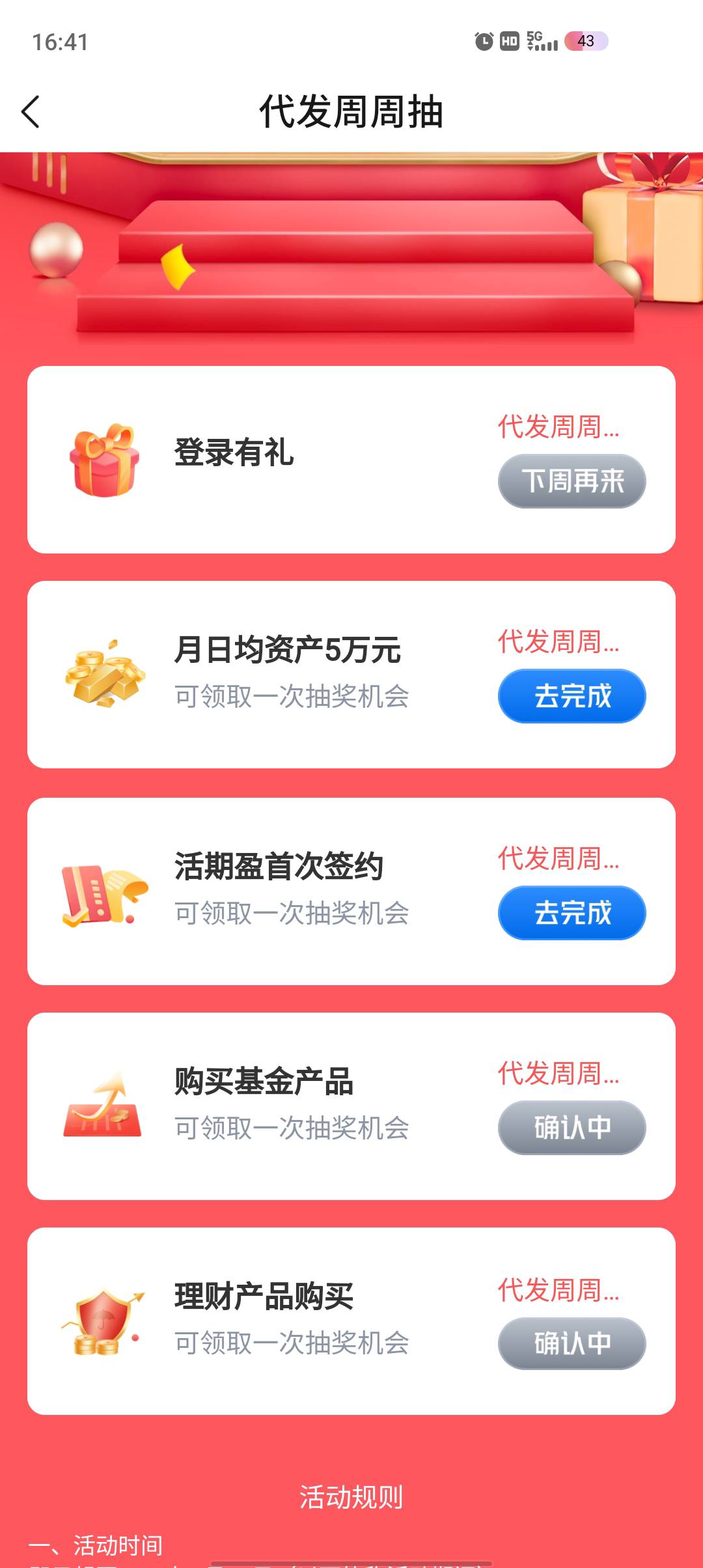 娇娇深圳:深享福利0.88×2 工资卡专区:代发周周抽可以抽一次,基金,理财各买1毛等确认能抽两次。