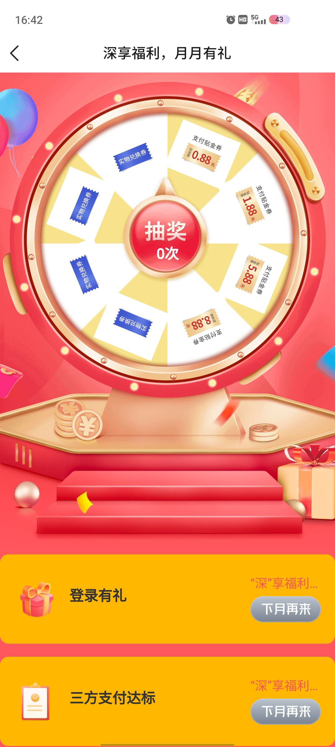 娇娇深圳:深享福利0.88×2 工资卡专区:代发周周抽可以抽一次,基