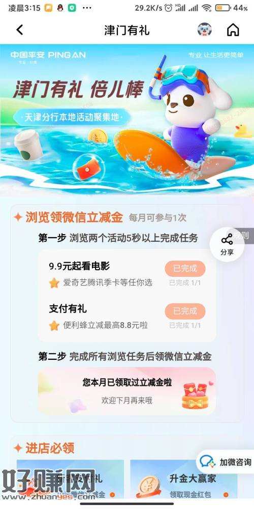 平安口袋银行app搜索津门有礼,倍儿棒 进去做任务抽立减金,