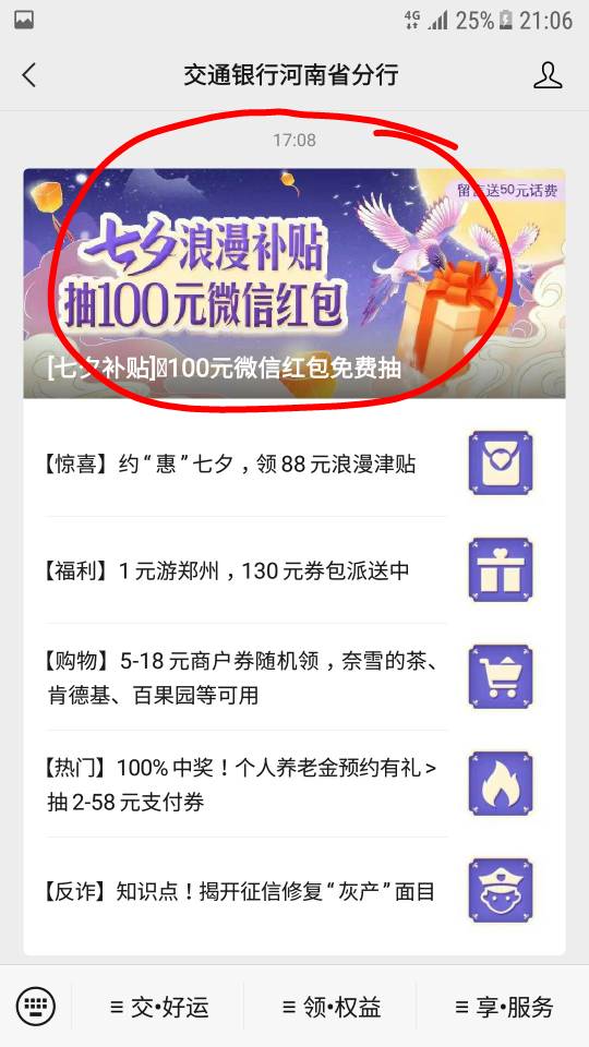 首发对不对!关注交通银行河南分行公众号,抽奖最高100。我脸黑几次都没