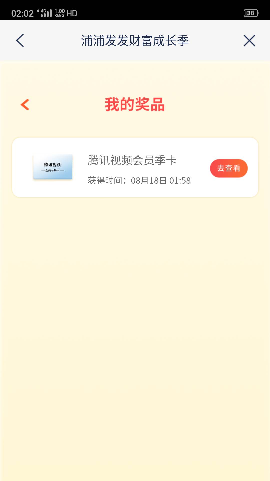 浦发银行—生活——浦浦发发财富季摇奖中了一个腾讯季卡,劵码的