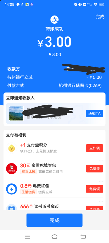 支付宝杭州银行转账 我转了8减了5 我没有立减金