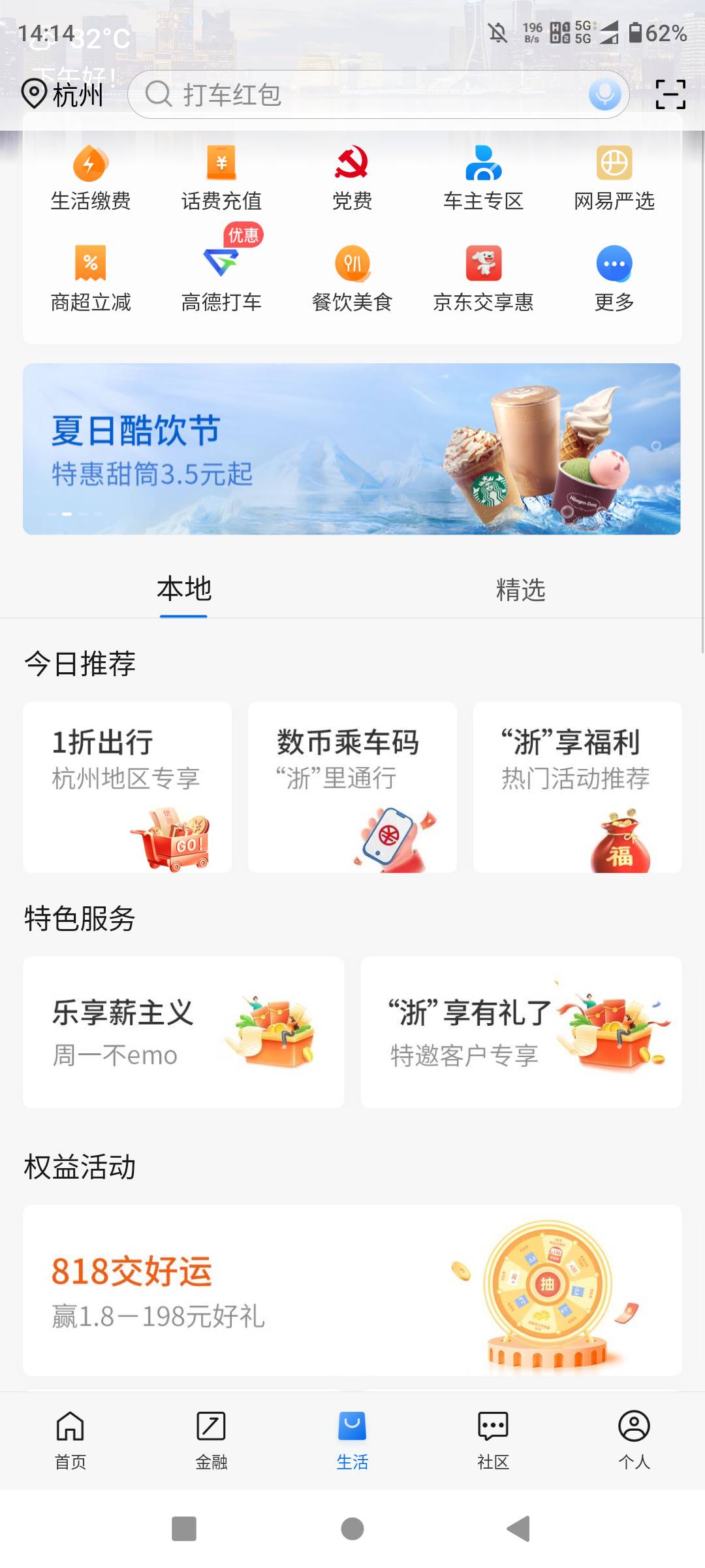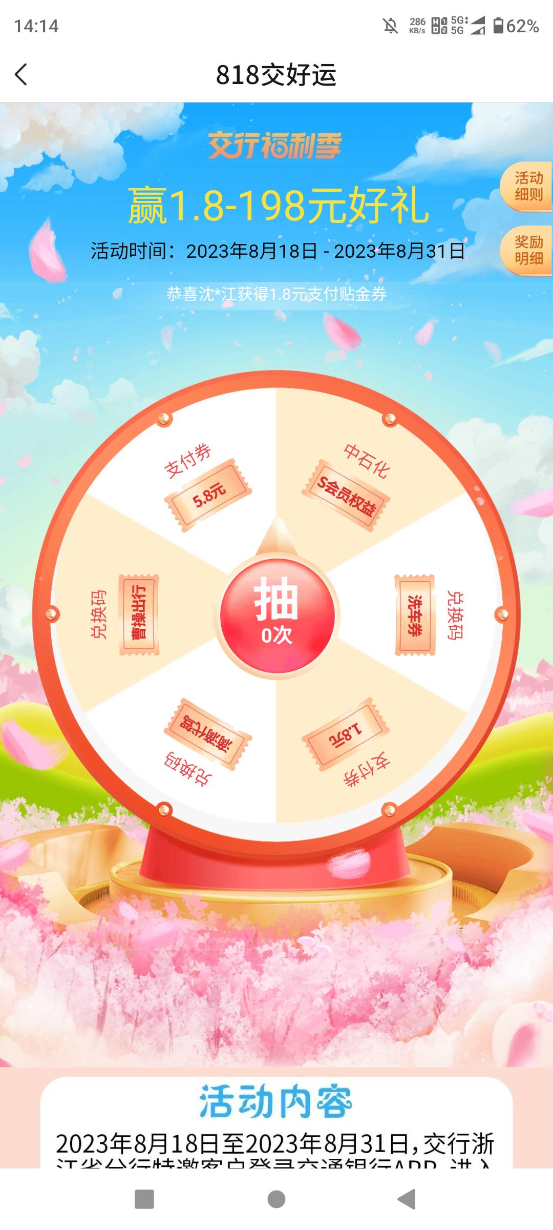 娇娇浙江818交好运 交行-生活-杭州-权益活动,需要开浙江省内卡,我是杭州电子,好运冲。