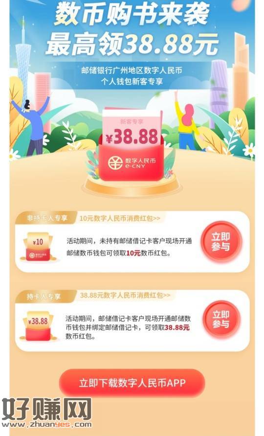 邮储新人可以领10数币,持卡用户未开通数币的可以领38.8,不在广州的需要定位至广州。
