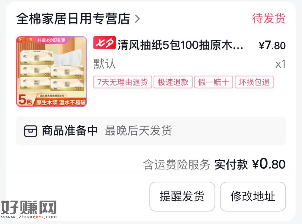 低价秒杀界面搜索纸巾,找到5.8的纸巾,然后0.8下单