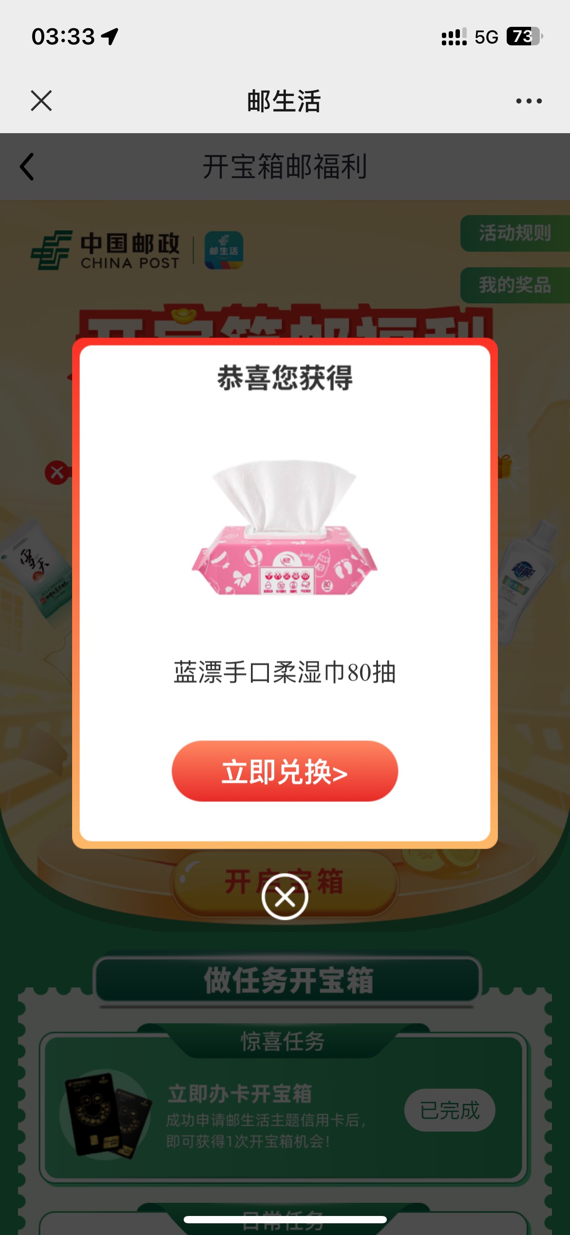 扫码进去点去办卡,然后到了立即申请哪里点立即申请插掉,重新扫码开一次宝箱,看运气中纸巾大米等福利