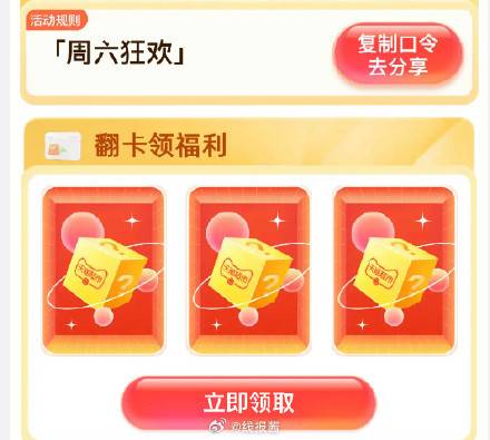 天猫超市-首页右下方悬浮图标“惊喜口令”-输入口令“周六狂欢”进入翻牌可领随机猫超卡