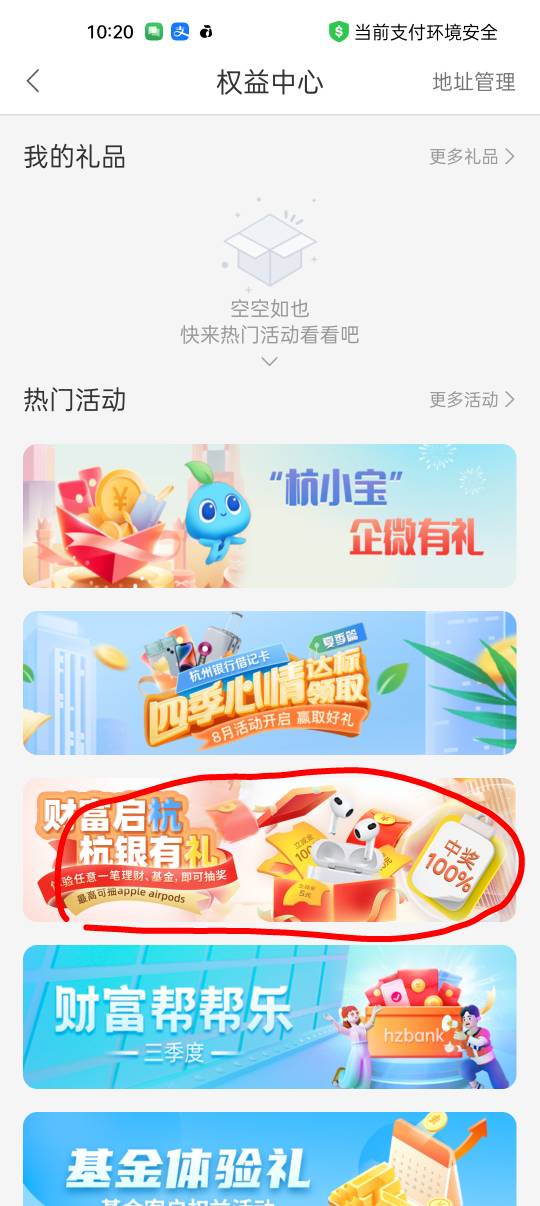 杭州银行微信立减金 杭州银行APP首页 权益中心,进去买1钱理财或者基