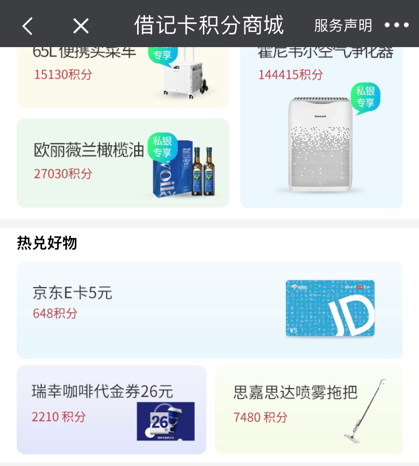 民生-有积分的去兑E卡和视频周卡。每样一天只能兑一次。