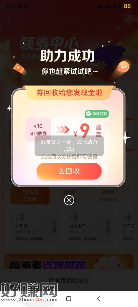 同城旅行搜券回收,可回收券10只用邀请一人助力,反至立返账号