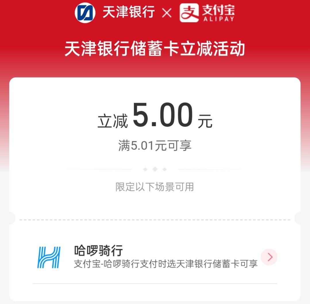 首发 天津银行今日限定 哈罗单车支付宝支付时可立减5 也可以充余