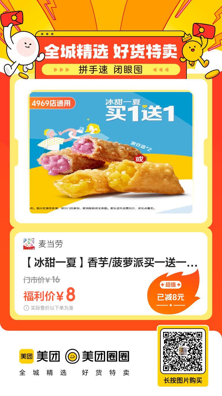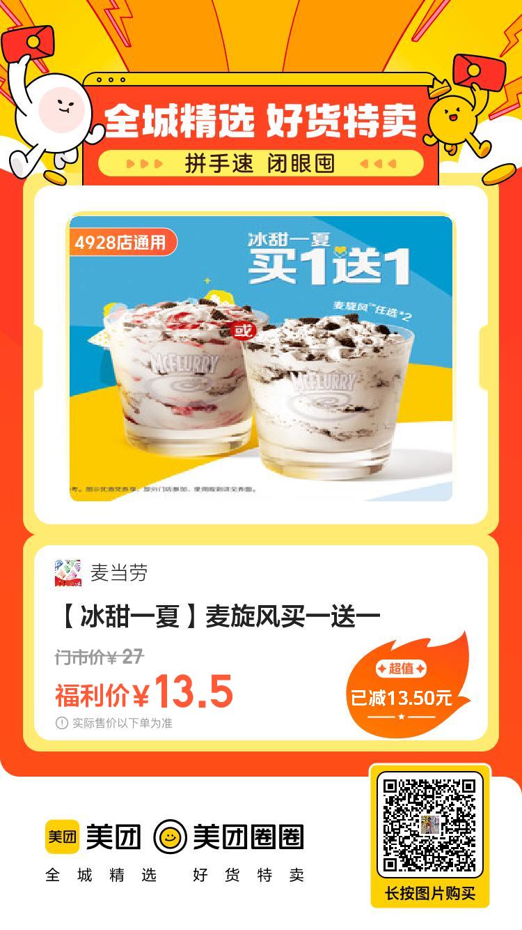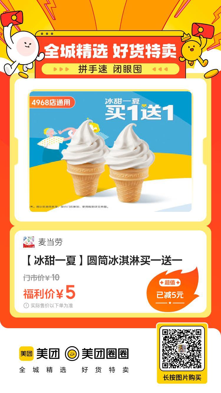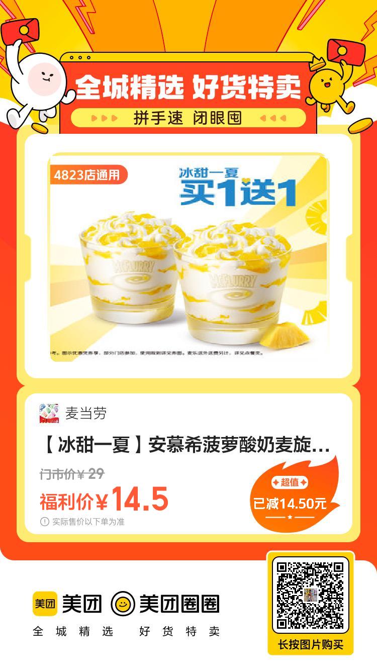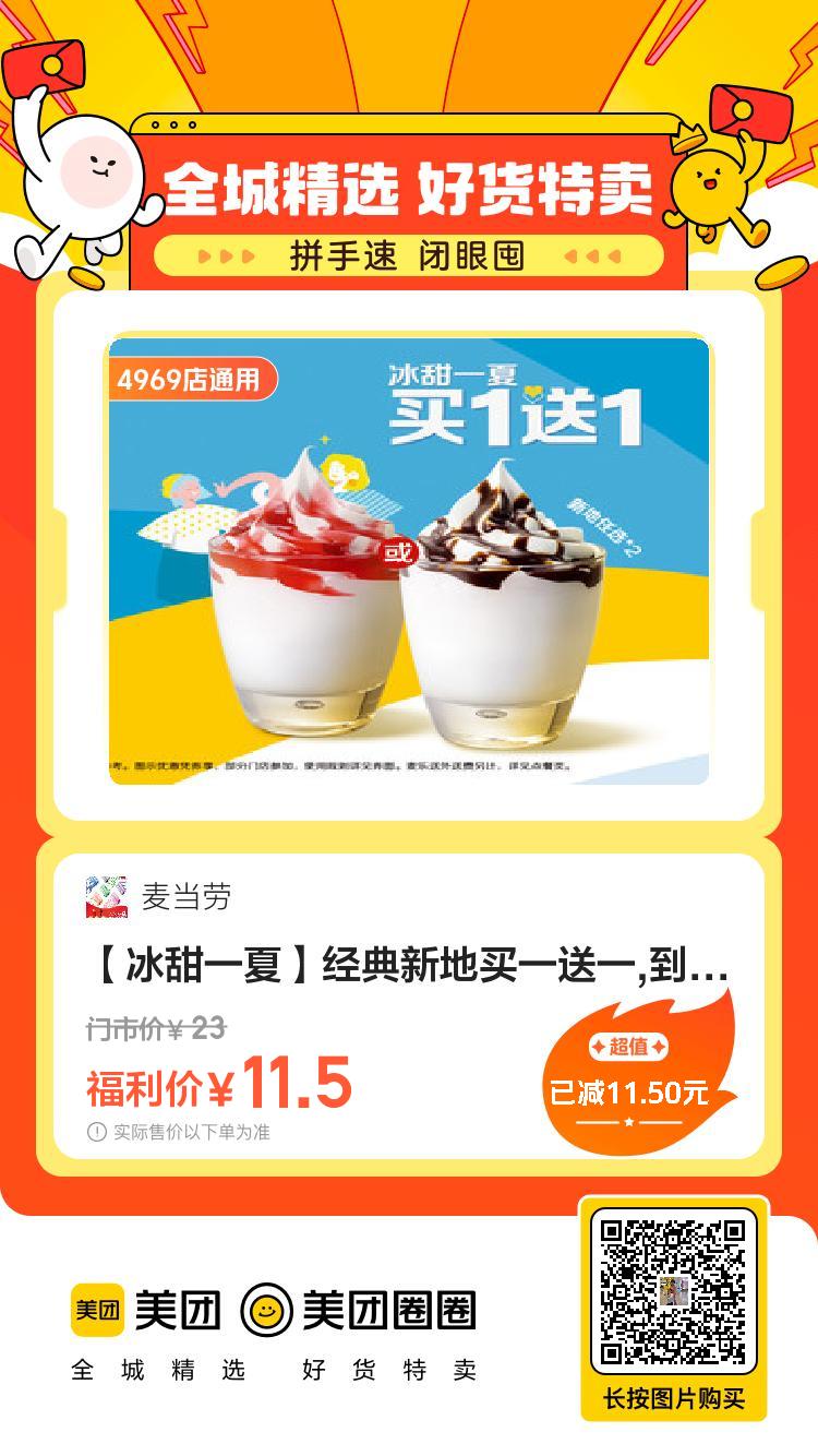 美团到店5,麦当劳|【冰甜一夏】圆筒冰淇淋买一送一8,麦当劳|【冰甜一夏】香芋/菠萝派买一送一11.5,麦当劳|【冰甜一夏】经典新地买一送一13.5,麦当劳|【冰甜一夏】麦旋风买一送一 14.5,麦当劳|【冰甜一夏】安慕希菠萝酸奶买一送一