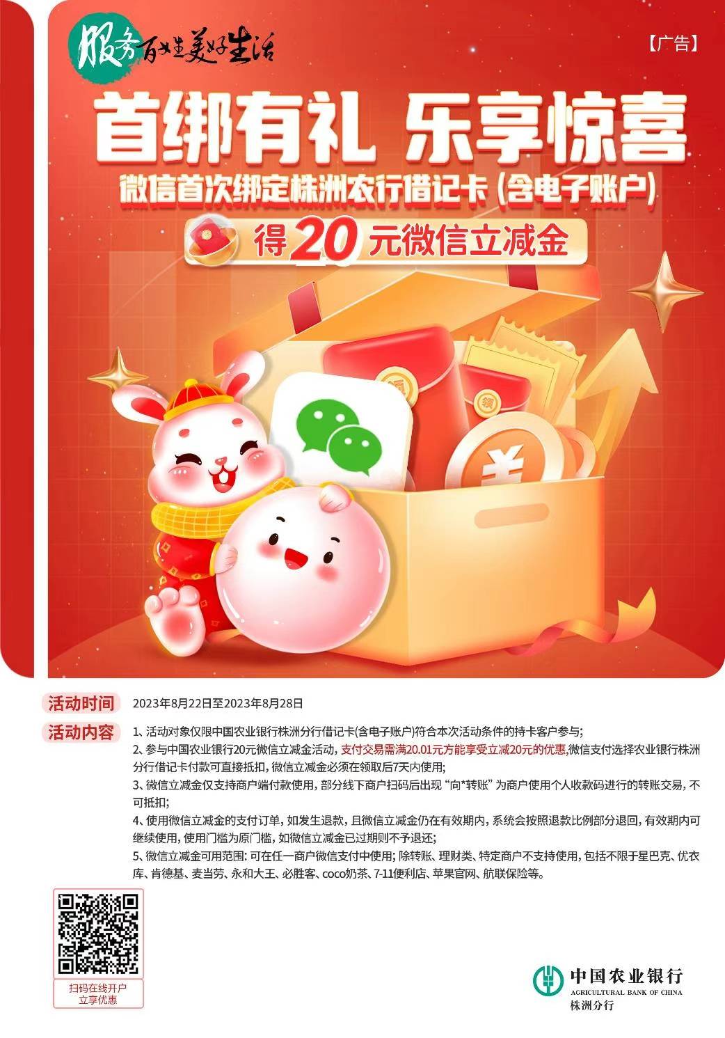 ️2023「用卡就用农行卡」 明日开始株洲专享 株洲农行借记卡首次绑定微信 立享20元微信立减金 --------------------------
