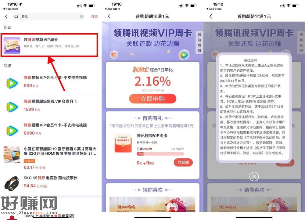 掌上生活APP->搜索“腾讯”进入->首次买1亓朝朝宝,领腾讯视频会员周卡,最后再卖掉就行了