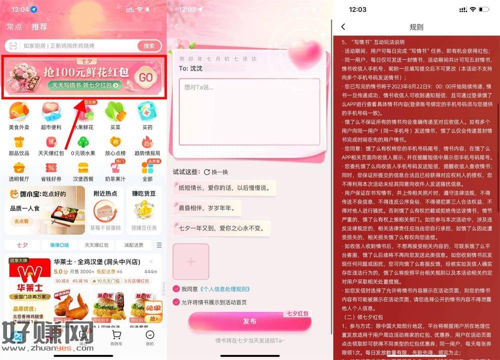 饿了么APP首页横幅进入->输入手机号并填写情书内容->明天将会短信通知对方,对方打开饿了么APP即可看见你写的情书