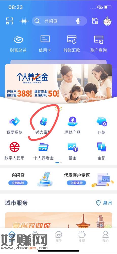 不用有卡,不用定位。兴业app,城市服务,钱大掌柜,点进去横