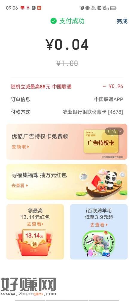 联通app充一元话费,选云闪付支付立减,实付几分
