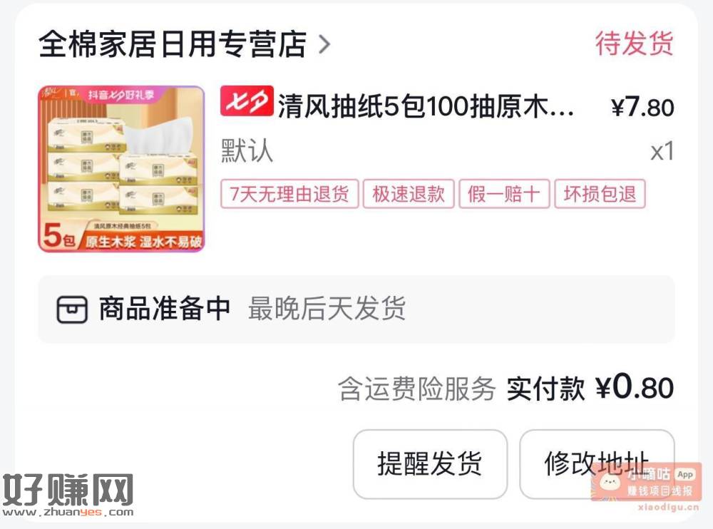 低价秒杀界面搜索纸巾,找到5.8的纸巾,然后0.8下单
