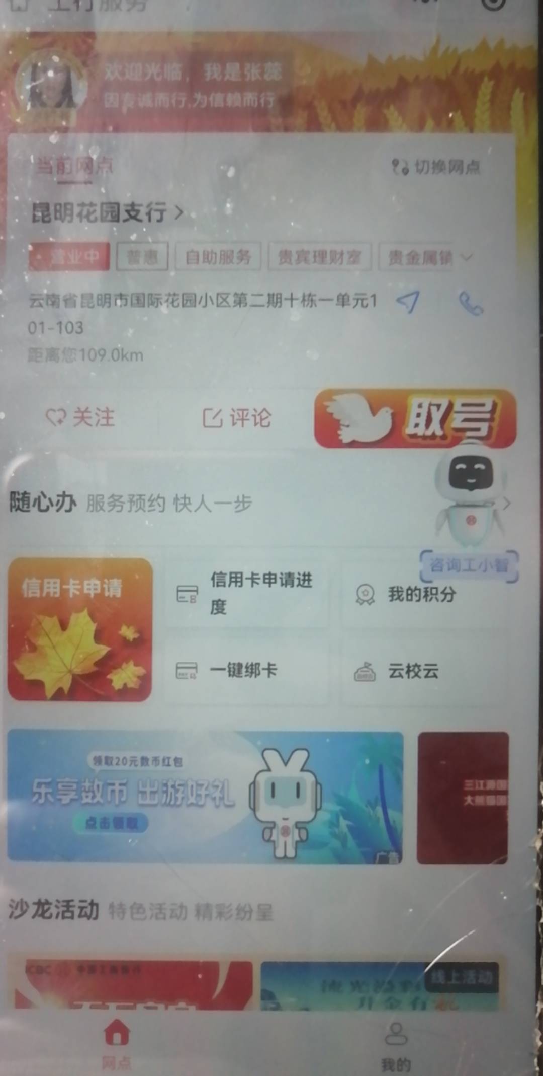 老哥们,V定位昆明,工行服务小程序随心办下面的横幅找到新客乐享和出游好