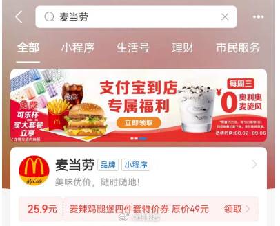 支付宝搜麦当劳,有0元随单麦旋风