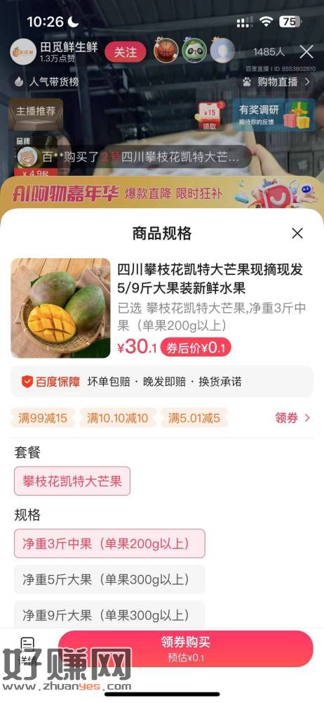 百度 右上角直播进去 搜田觅鲜生鲜