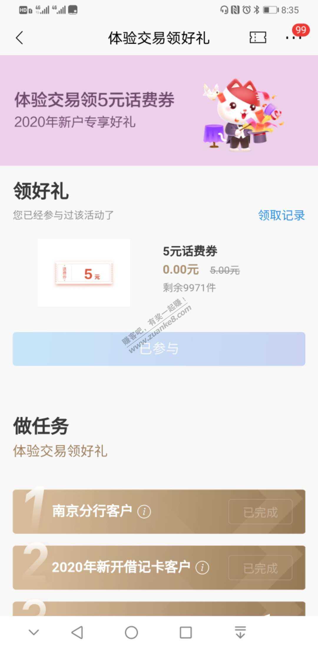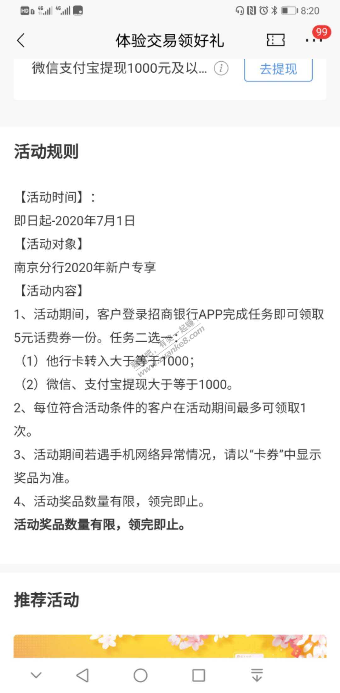 招行南京分行2020新用户领五元话费