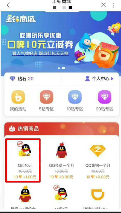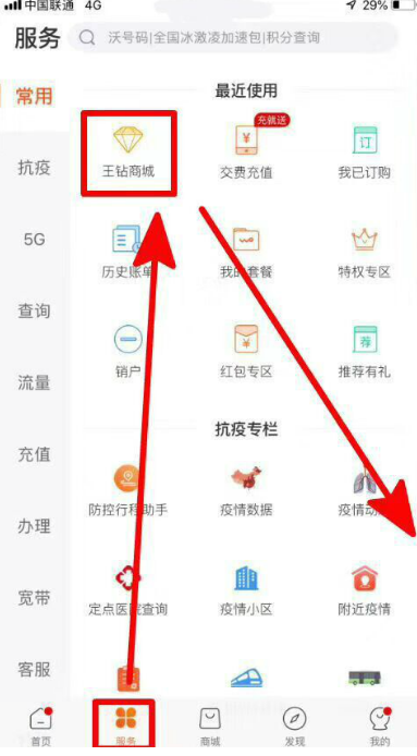打开联通营业厅APP->菜单栏点击服务“王钻商城”->可以兑换1元充10QB->