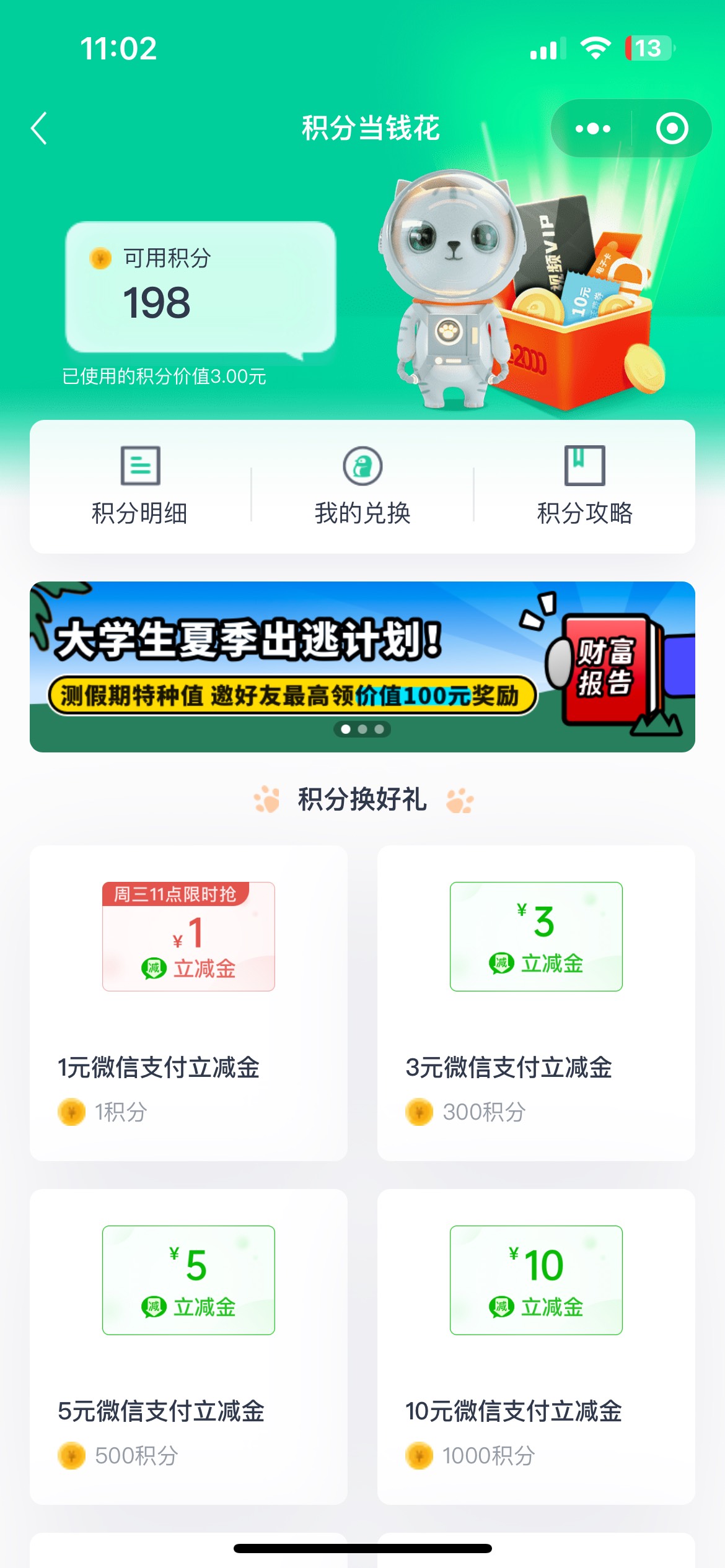 每周三11点微众银行,1积分兑换一块钱立减金,看得上的去吧,应该还有库