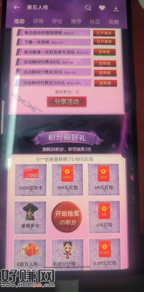 OPPO游戏中心第五人格,下载打开25积分抽奖,不必中。手机号多的换号继续抽