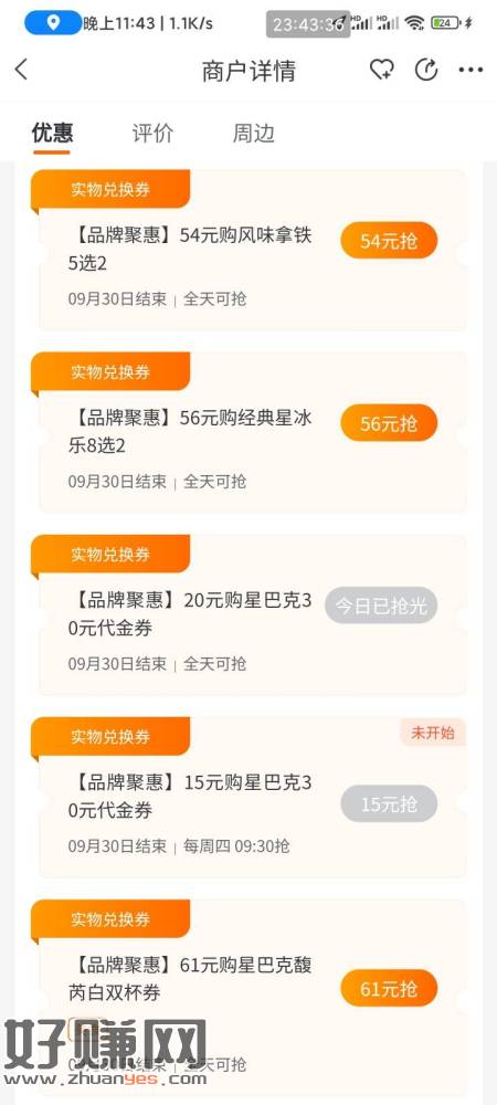 12. 建行生活搜星巴克 随便进一家店 20买30星巴克券 玖玖卖掉润6.5 不太好抢