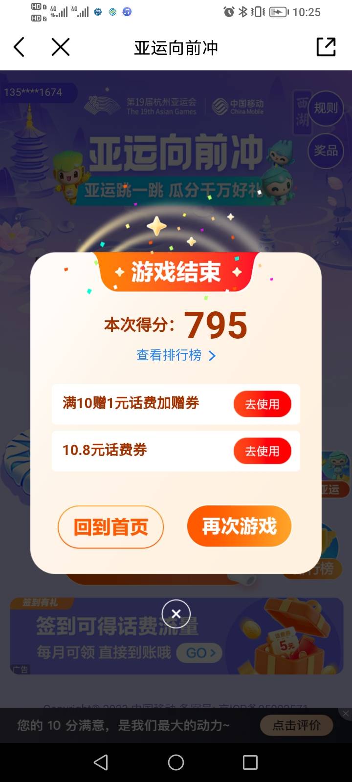 移动首页横幅进去玩跳一跳游戏小水了一下,游戏前1000名得10话费