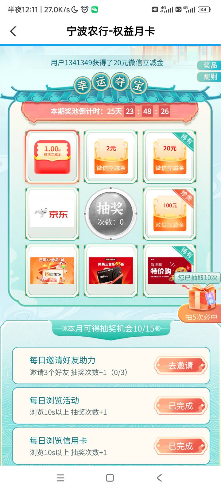 宁波农行, 宁波有礼,权益月卡,幸运夺宝抽奖,好运100