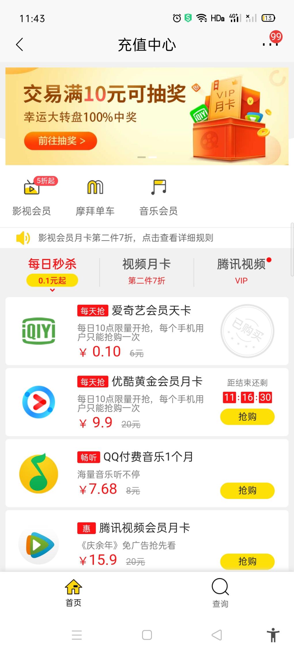 招商银行app搜索充值,进入充值中心,1毛秒杀天卡,大量有货