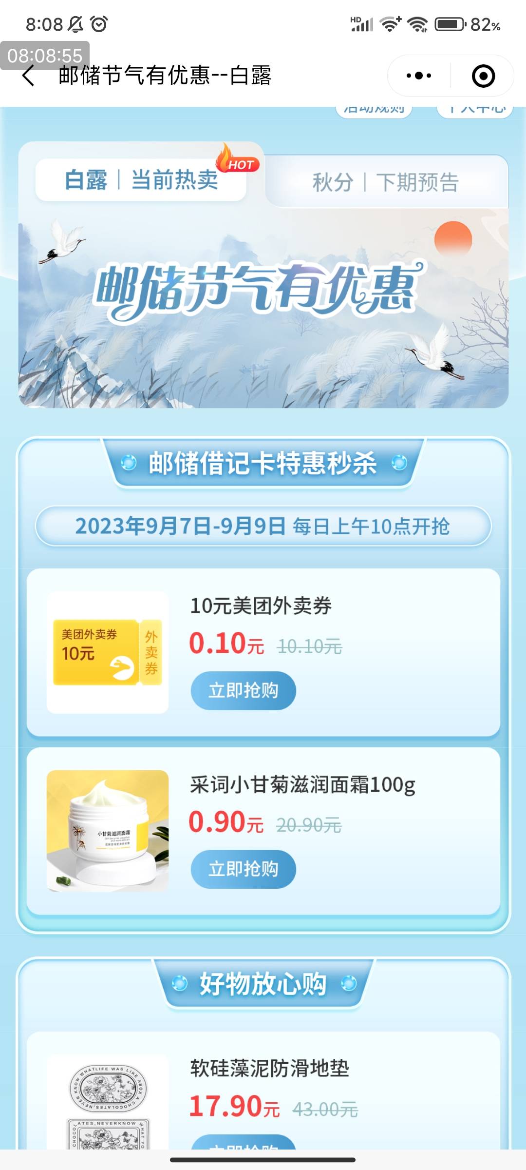 小程序,邮储好礼汇, 白露节日优惠,10点,抢购!