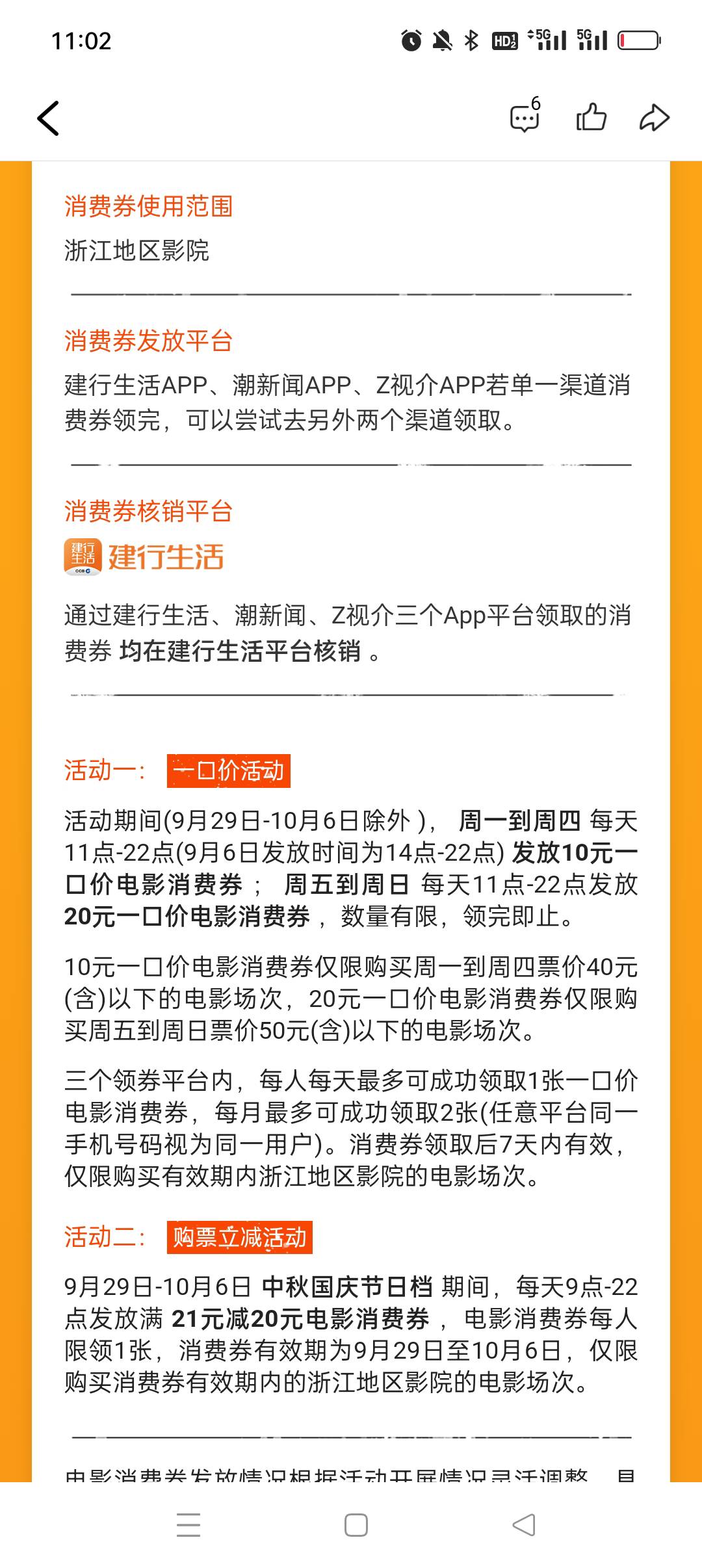 建行生活浙江用户可以领取电影票40以内10元兑换,兑换日期是周一到周四,有效期1星期,浙江内电影都可以用,建行生活没卷了的可以下载z视介和潮新闻领取