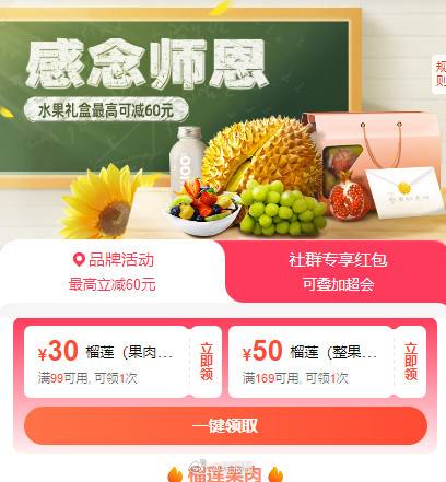 饿了么,教师节可领鲜花79-20和129-30,水果榴莲有99-30