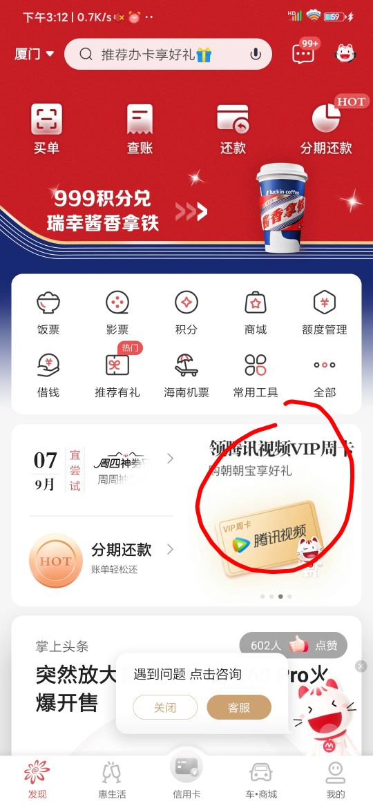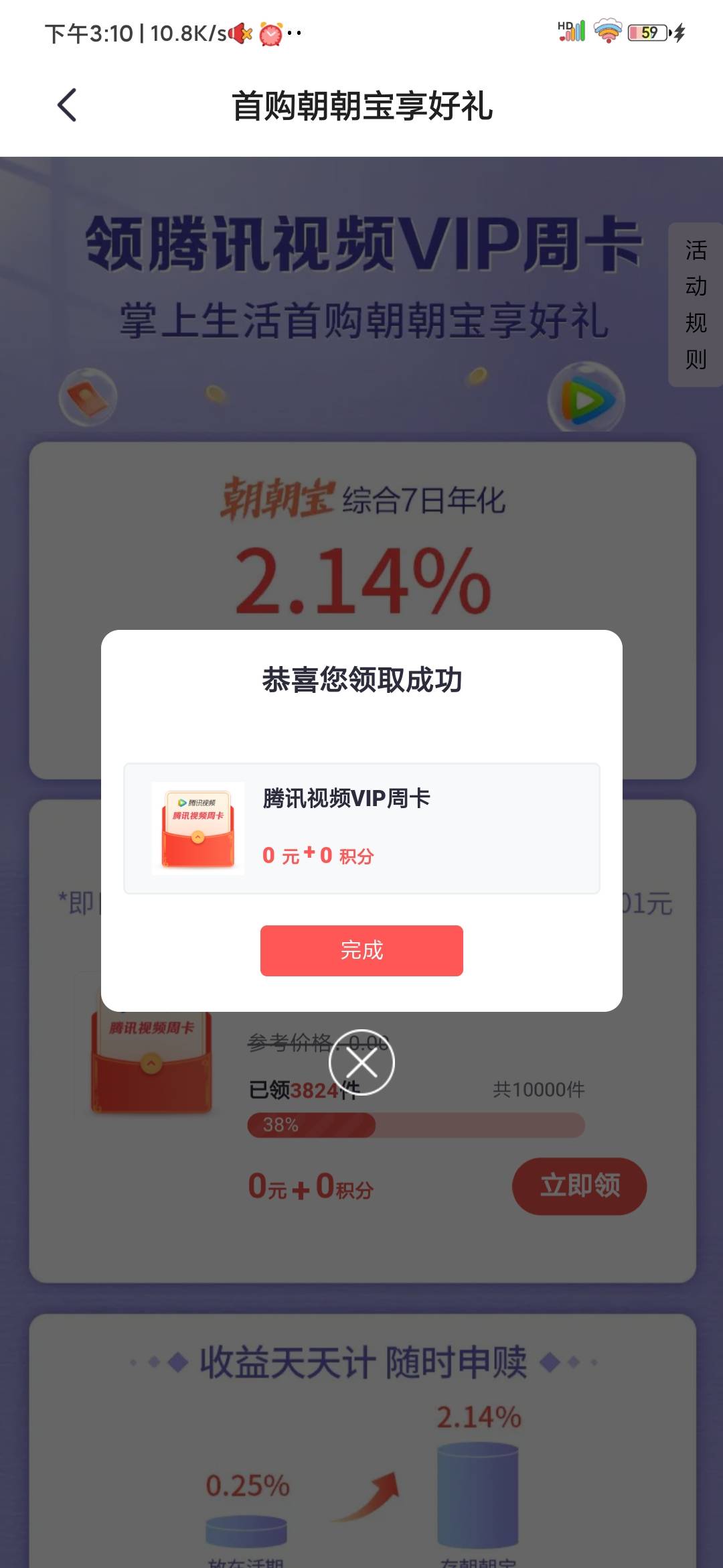 首发: 掌上生活首页 购买任意金额朝朝宝 领取腾讯视频周卡,直接挂玖玖