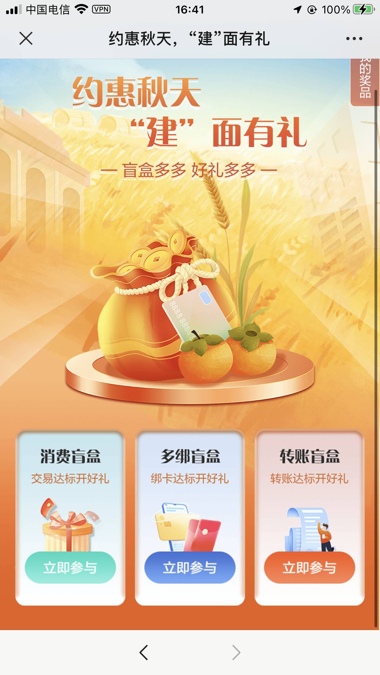首发河北建行消费盲盒,之前玩过的看过来,现在限制参加一个地区的,所以你需要知道上次玩的哪儿个地区,比如上次我参加的唐山曹妃甸,我现在还定位曹妃甸去参加,之前一直没玩的,W视就行,入口下图公众号,