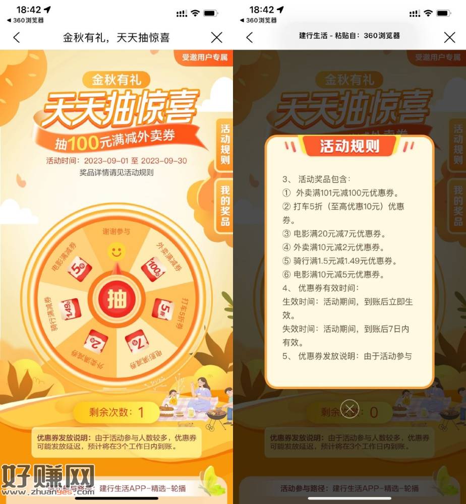 建行生活APP扫码->每天1次机会抽外卖、打车、电影满减券等奖励!