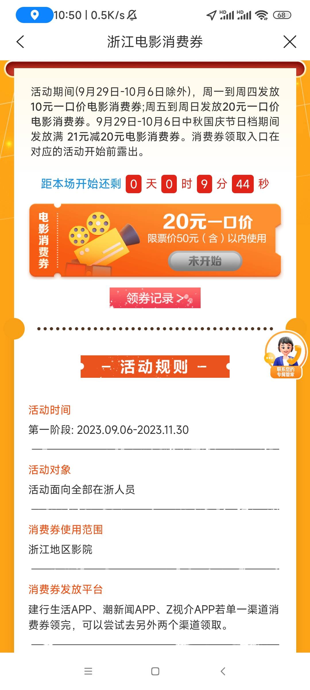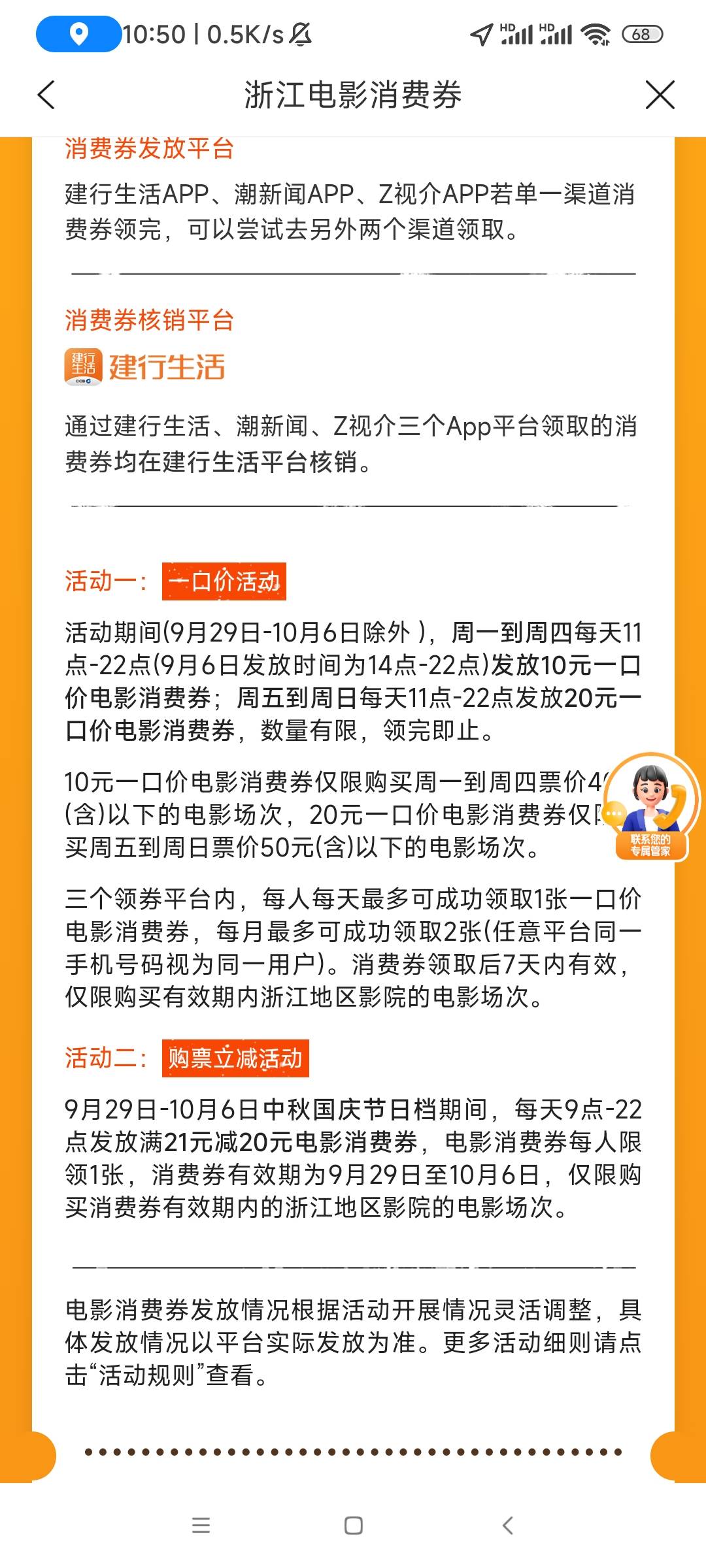 建行生活,左上定位浙江,中间横幅2500万电影消费券那,50-20的券,会接单的话是有点利润的。人在广东不知道能不能领,本来想测试出能不能领能不能多号再发的,老哥们自己测试吧