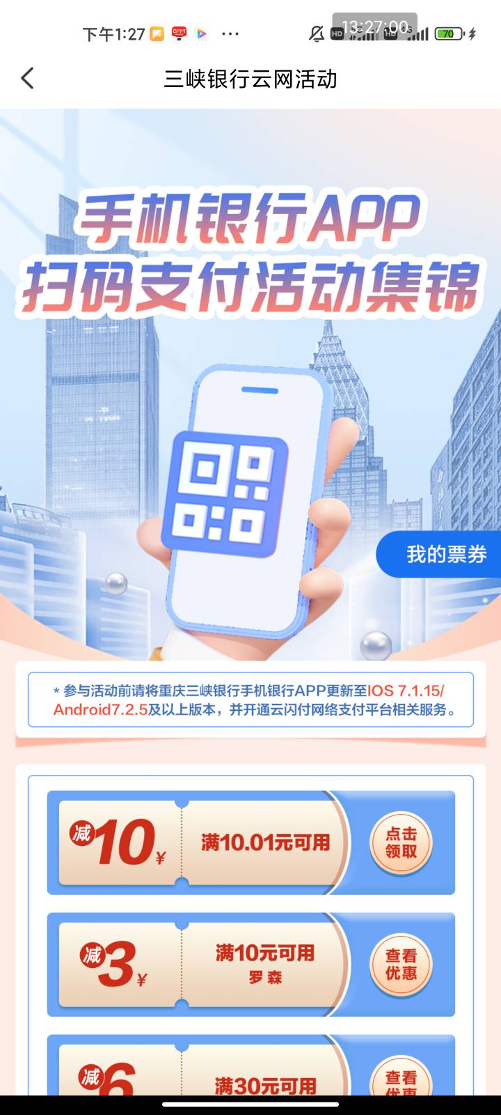 三峡银行app10毛冲 三峡付的卡绑云少妇就行 再去三峡银行app首页右上角加号点付款码被扫抵扣