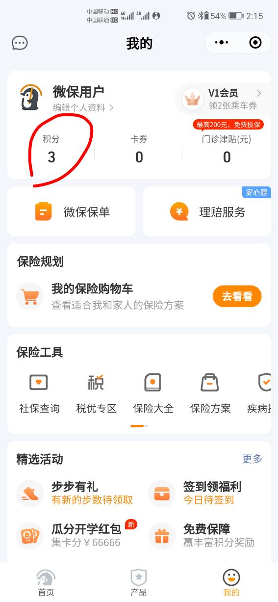 发个小毛把,入口腾讯微保,点我的,进积分,把任务全做一下随便都够500分换5块,图二中的保单可以交三次,就是300分,我全部是乱填的,快冲!