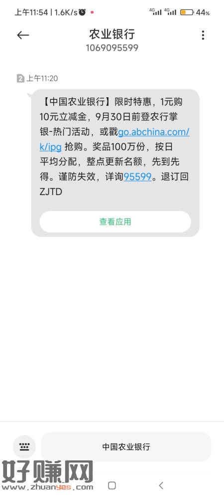 【中国农业银行】限时特惠,1元购10元立减金,9月30日前登农行掌银-热门活动,或戳go.abchina.com/k/ipg 抢购。奖品100万份,按日平均分配,整点更新名额,先到先得。谨防失效,详询95599。退订回ZJTD