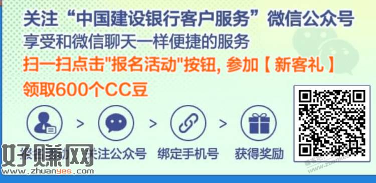扫码接任务。关注建行银行客户服务公众号,在公众号绑定自己建行手机得600cc豆,延迟到账