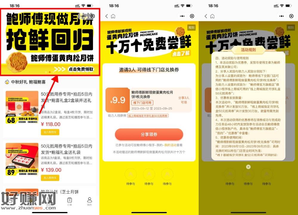 微信打开小程序:鲍师傅->点击横幅进入->邀请3人助力得月饼兑换券,48小时内自动发放->到附近“鲍师傅糕点”门店即可兑换。
