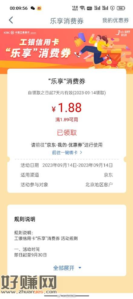 北京工行搜消费季有京东1.88支付券