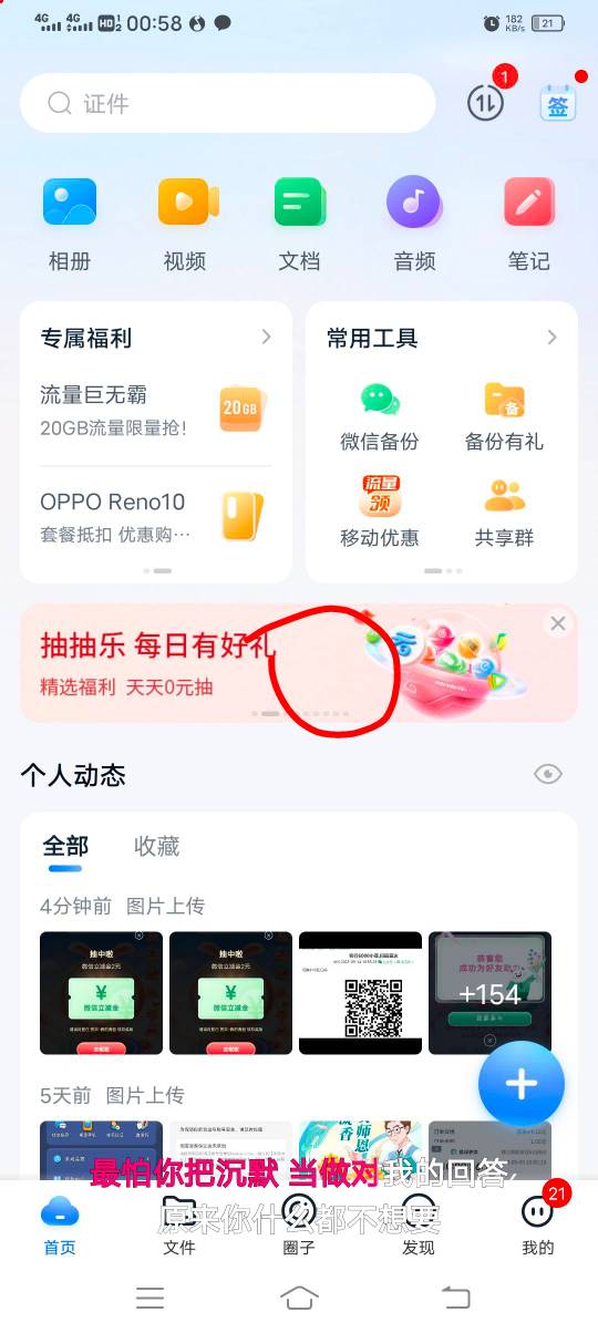 加个静,移动云盘横幅抽奖,有立减金其他乱七八糟,一直点抽奖点到不出货为