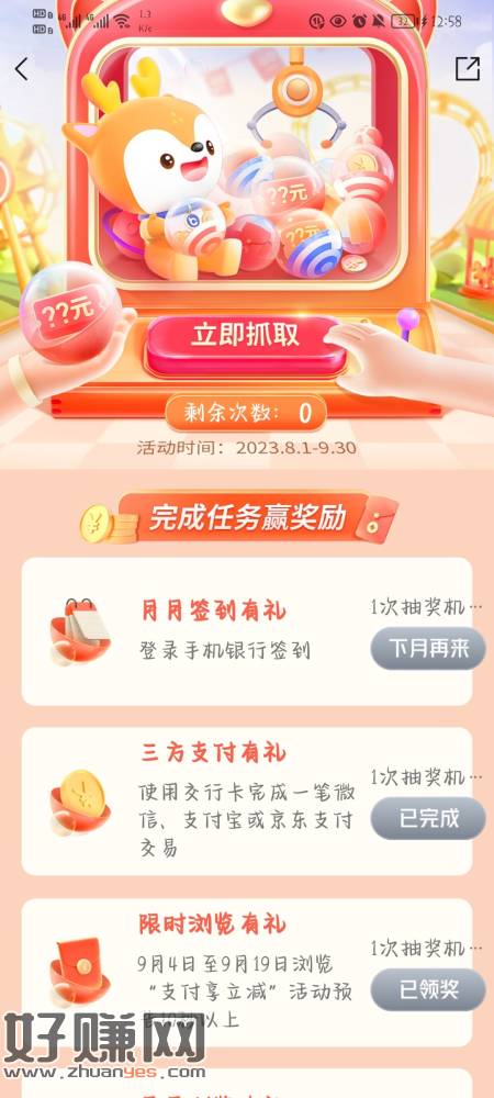 交通银行月月有礼加了一个限时浏览活动,完成能抽一次