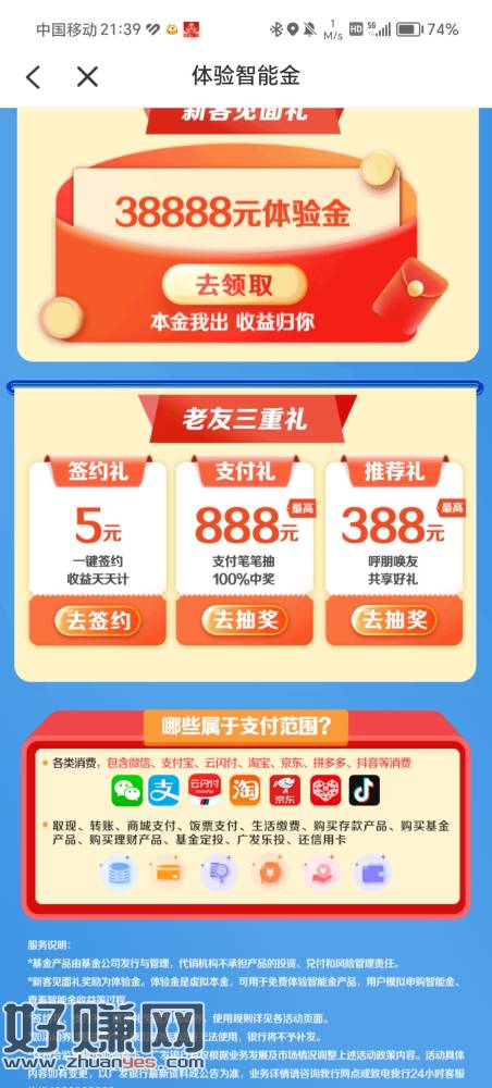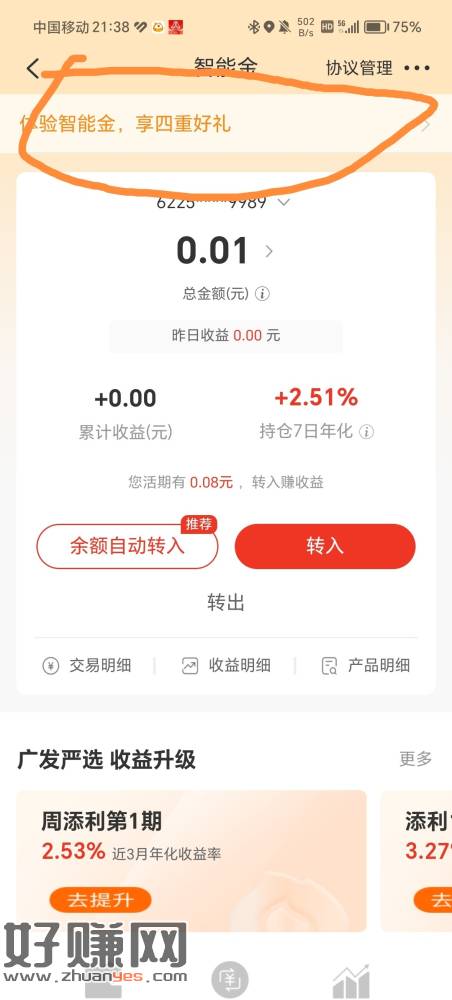 广发银行首页搜索智能金然后上面四重礼点进去老友礼第一个转入0.01能领5元立减金