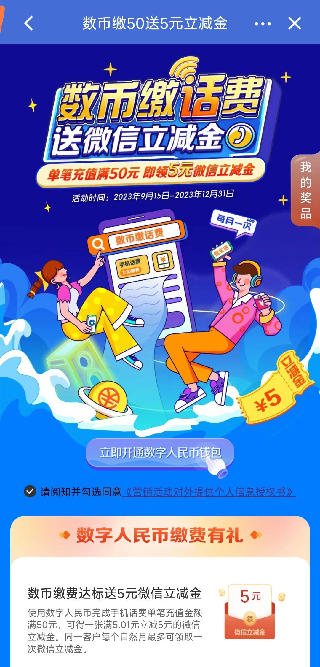 建行数币交话费送5元立减金 连送4个月20块 即日至12月31日,每
